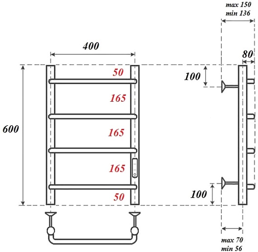 Комплектация: полотенцесушитель, телескопическое крепление к стене (4 шт.), сетевой кабель.