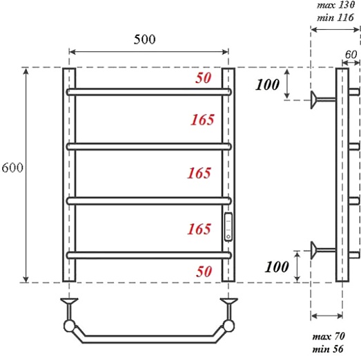 Комплектация: полотенцесушитель, телескопическое крепление к стене (4 шт.), сетевой кабель.