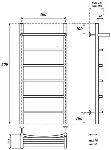 Комплектация: полотенцесушитель, телескопическое крепление к стене (4 шт.), ТЭН с терморегулятором.