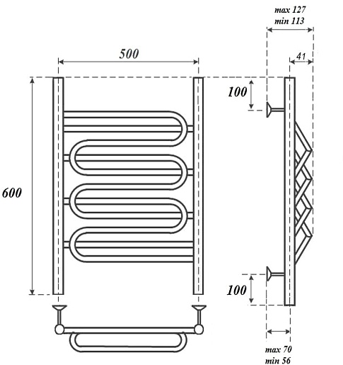 Комплектация: полотенцесушитель, телескопическое крепление к стене (4 шт.), ТЭН с терморегулятором.