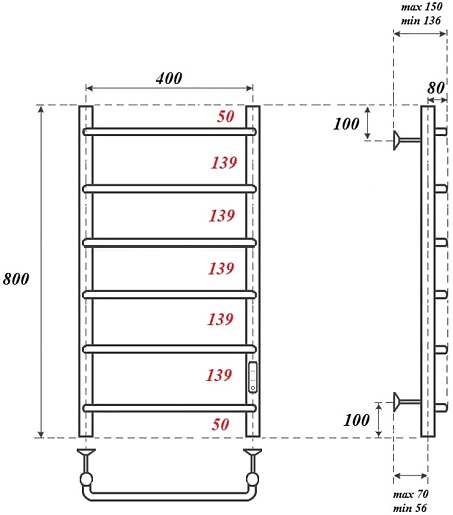 Комплектация: полотенцесушитель, телескопическое крепление к стене (4 шт.), сетевой кабель.