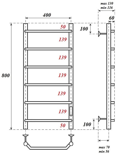 Комплектация: полотенцесушитель, телескопическое крепление к стене (4 шт.), сетевой кабель.