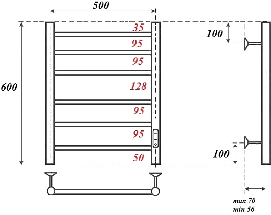 Комплектация: полотенцесушитель, телескопическое крепление к стене (4 шт.), сетевой кабель.