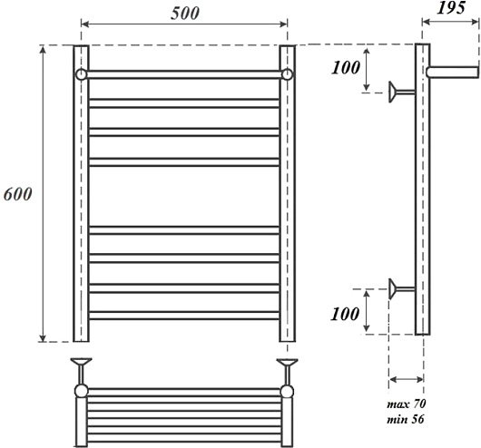 Комплектация: полотенцесушитель, телескопическое крепление к стене (4 шт.), ТЭН с терморегулятором.