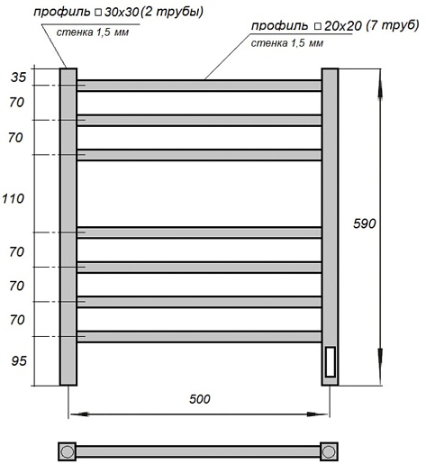 Комплектация: полотенцесушитель, телескопическое крепление к стене (4 шт.), сетевой кабель.