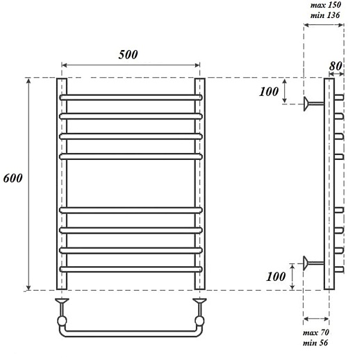 Комплектация: полотенцесушитель, телескопическое крепление к стене (4 шт.), ТЭН с терморегулятором.