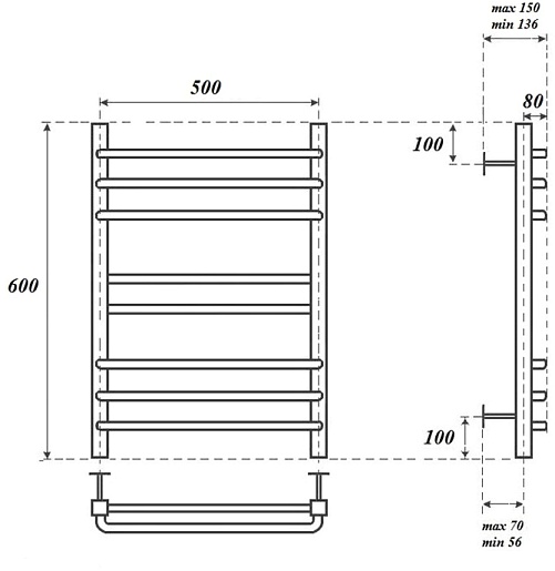 Комплектация: полотенцесушитель, телескопическое крепление к стене (4 шт.), ТЭН с терморегулятором.