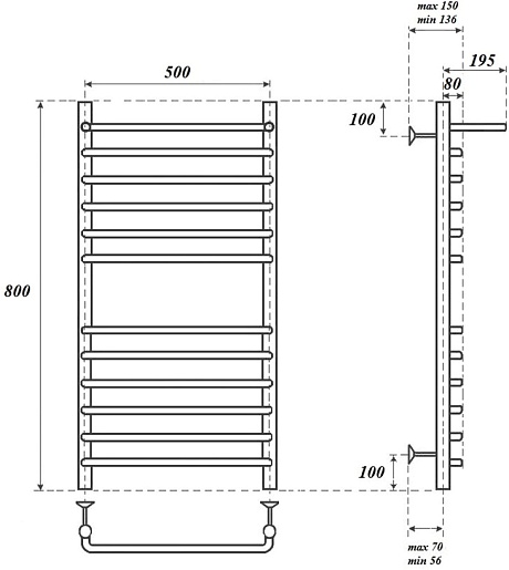 Комплектация: полотенцесушитель, телескопическое крепление к стене (4 шт.), кран Маевского.