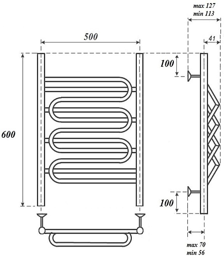 Комплектация: полотенцесушитель, телескопическое крепление к стене (4 шт.), кран Маевского.