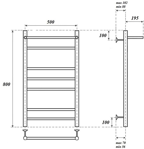 Комплектация: полотенцесушитель, телескопическое крепление к стене (4 шт.), кран Маевского.