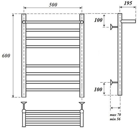 Комплектация: полотенцесушитель, телескопическое крепление к стене (4 шт.), кран Маевского.