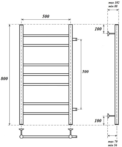 Комплектация: полотенцесушитель, телескопическое крепление к стене (4 шт.), кран Маевского.
