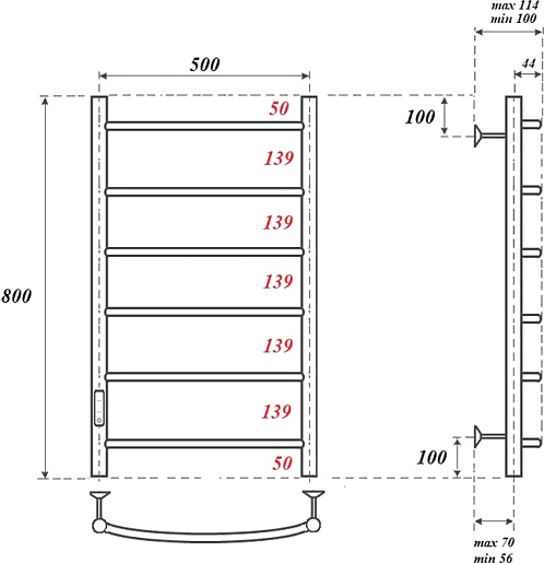 Комплектация: полотенцесушитель, телескопическое крепление к стене (4 шт.), сетевой кабель.