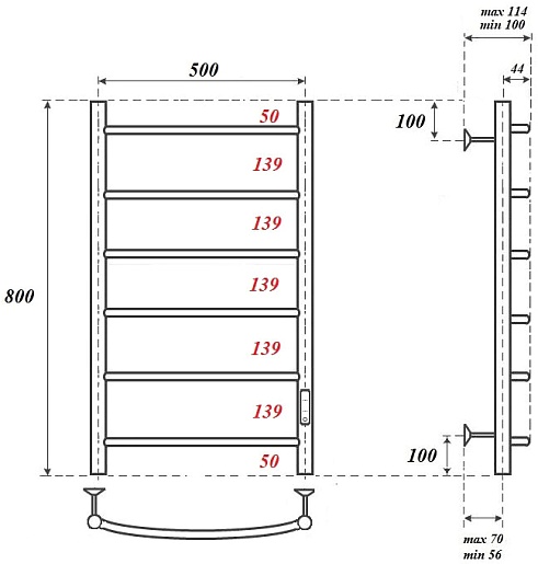 Комплектация: полотенцесушитель, телескопическое крепление к стене (4 шт.), сетевой кабель.