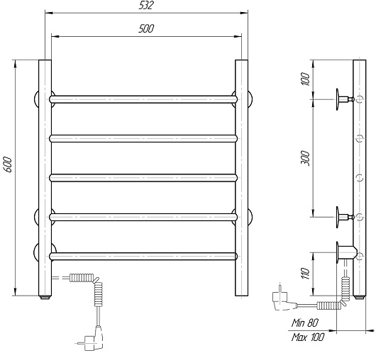 Комплектация: полотенцесушитель, кронштейн (4 шт.), комплект для скрытого подключения, провод с вилкой.