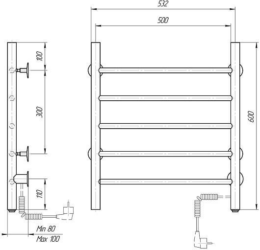 Комплектация: полотенцесушитель, кронштейн (4 шт.), комплект для скрытого подключения, провод с вилкой.