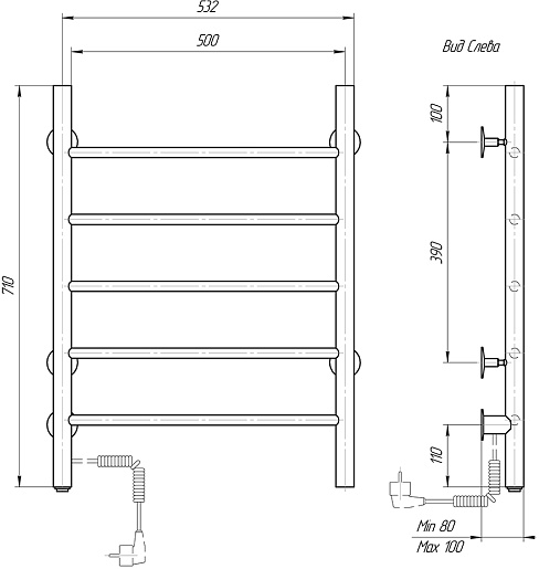 Комплектация: полотенцесушитель, кронштейн (4 шт.), комплект для скрытого подключения, провод с вилкой.