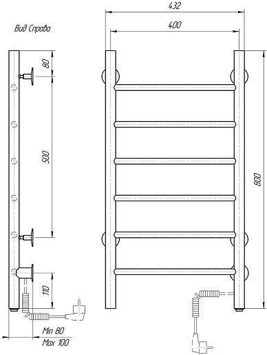 Комплектация: полотенцесушитель, кронштейн (4 шт.), комплект для скрытого подключения, провод с вилкой.