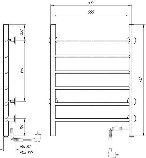 Комплектация: полотенцесушитель, кронштейн (4 шт.), комплект для скрытого подключения, провод с вилкой.