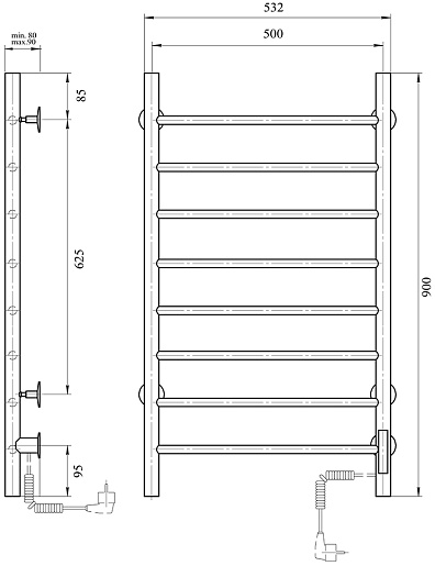 Комплектация: полотенцесушитель, крепление телескопическое (4 шт.), комплект для скрытого подключения, провод с вилкой.