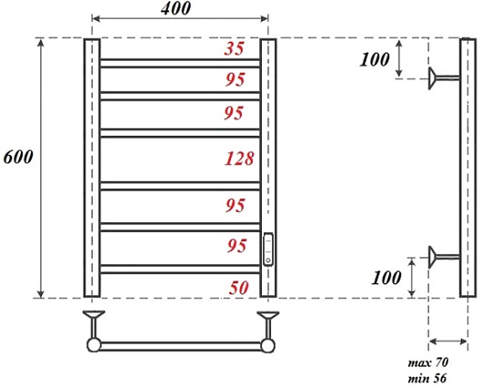Комплектация: полотенцесушитель, телескопическое крепление к стене (4 шт.), сетевой кабель.