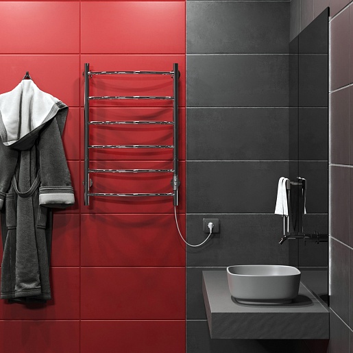 Комплектация: полотенцесушитель, комплект скрытого подключения, нагревательный кабель, выключатель с таймером и терморегулятором, шнур электропитания с вилкой, телескопический держатель (4 шт.).