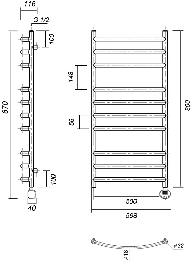 Комплектация: полотенцесушитель с ТЭНом в сборе, кронштейн (4 шт.), кран Маевского, заглушка, терморегулятор, провод с вилкой.