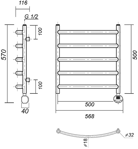 Комплектация: полотенцесушитель с ТЭНом в сборе, кронштейн (4 шт.), кран Маевского, заглушка, терморегулятор, провод с вилкой.