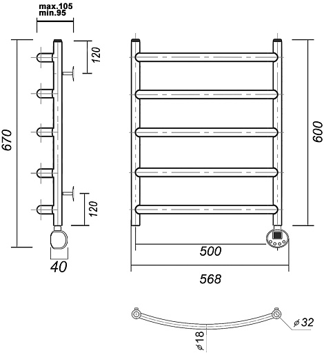 Комплектация: полотенцесушитель с ТЭНом в сборе, кронштейн (4 шт.), кран Маевского, заглушка, терморегулятор, провод с вилкой.