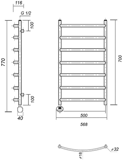 Комплектация: полотенцесушитель с ТЭНом в сборе, кронштейн (4 шт.), кран Маевского, заглушка, терморегулятор, провод с вилкой.