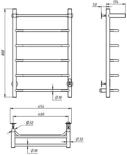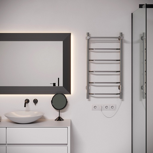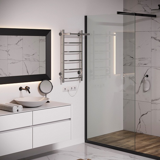 Комплектация: полотенцесушитель, комплект скрытого подключения, нагревательный кабель, выключатель с таймером и терморегулятором, шнур электропитания с вилкой, телескопический держатель (4 шт.).