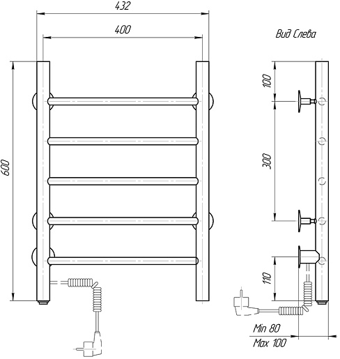 Комплектация: полотенцесушитель, кронштейн (4 шт.), комплект для скрытого подключения, провод с вилкой.