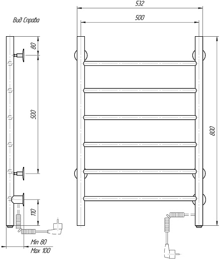 Комплектация: полотенцесушитель, кронштейн (4 шт.), комплект для скрытого подключения, провод с вилкой.