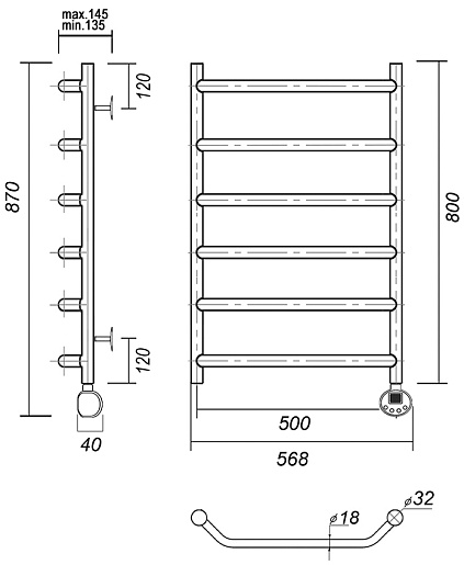 Комплектация: полотенцесушитель с ТЭНом в сборе, кронштейн (4 шт.), кран Маевского, заглушка, терморегулятор, провод с вилкой.