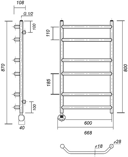 Комплектация: полотенцесушитель с ТЭНом в сборе, кронштейн (4 шт.), кран Маевского, заглушка, терморегулятор, провод с вилкой.