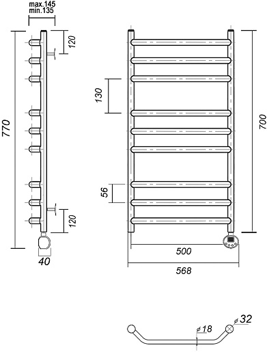 Комплектация: полотенцесушитель с ТЭНом в сборе, кронштейн (4 шт.), кран Маевского, заглушка, терморегулятор, провод с вилкой.