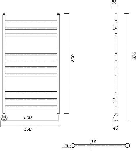 Комплектация: полотенцесушитель с ТЭНом в сборе, кронштейн (4 шт.), кран Маевского, заглушка, терморегулятор, провод с вилкой.