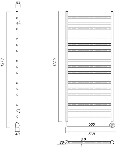 Комплектация: полотенцесушитель с ТЭНом в сборе, кронштейн (4 шт.), кран Маевского, заглушка, терморегулятор, провод с вилкой.