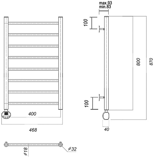 Комплектация: полотенцесушитель с ТЭНом в сборе, кронштейн (4 шт.), кран Маевского, заглушка, терморегулятор, провод с вилкой.