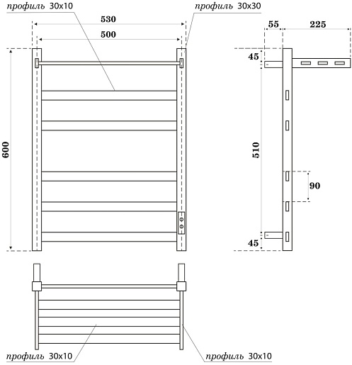 Комплектация: полотенцесушитель, крепление к стене (3 шт.), сетевой кабель.