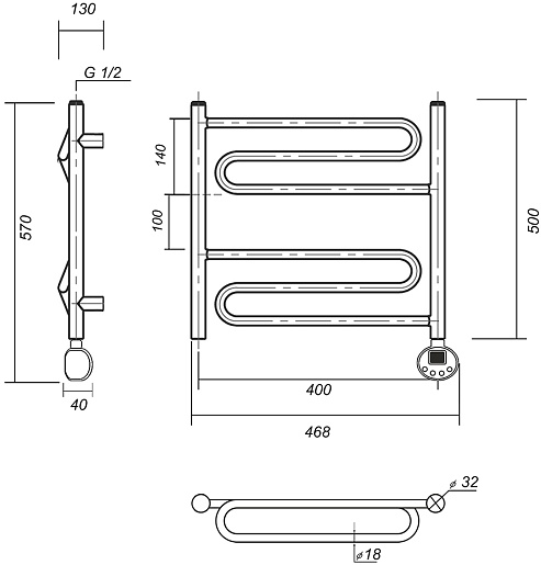 Комплектация: полотенцесушитель с ТЭНом в сборе, кронштейн (4 шт.), кран Маевского, заглушка, терморегулятор, провод с вилкой.