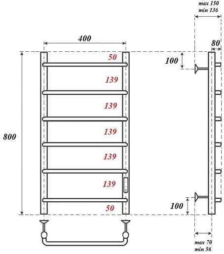 Комплектация: полотенцесушитель, телескопическое крепление к стене (4 шт.), сетевой кабель.