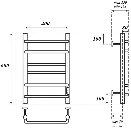 Комплектация: полотенцесушитель, крепление к стене (3 шт.), сетевой кабель.