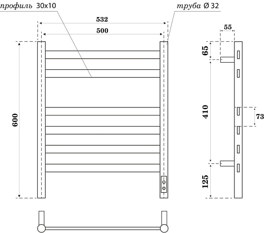 Комплектация: полотенцесушитель, крепление к стене, сетевой кабель.