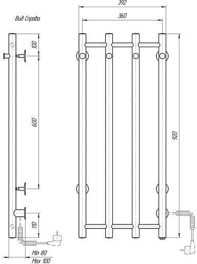 Комплектация: полотенцесушитель, кронштейн (4 шт.), комплект для скрытого подключения, провод с вилкой.