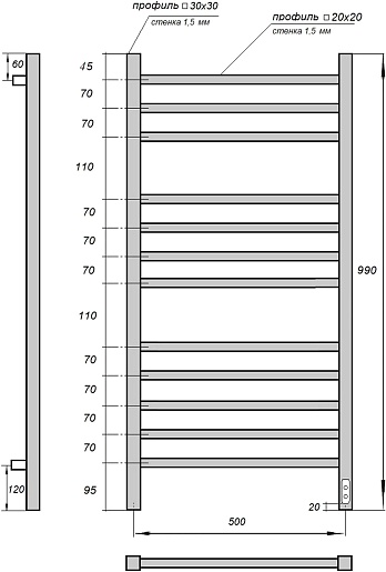 Комплектация: полотенцесушитель, телескопическое крепление к стене (4 шт.), сетевой кабель.