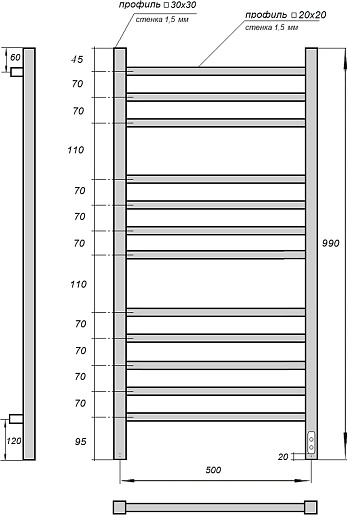 Полотенцесушитель электрический Point Вега П12 500x1000 PN71850B черный.