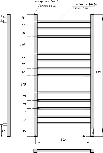 Комплектация: полотенцесушитель, телескопическое крепление к стене (4 шт.), сетевой кабель.