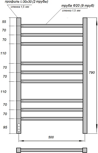 Комплектация: полотенцесушитель, телескопическое крепление к стене (4 шт.), сетевой кабель.