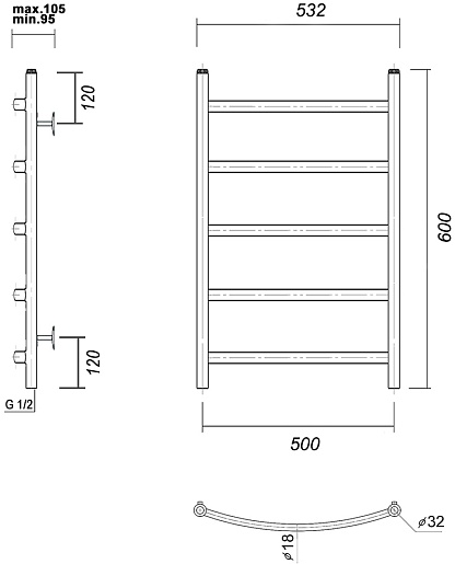 Комплектация: полотенцесушитель, крепление телескопическое (4 шт.), заглушка, кран Маевского, угловой переходник (2 шт.).